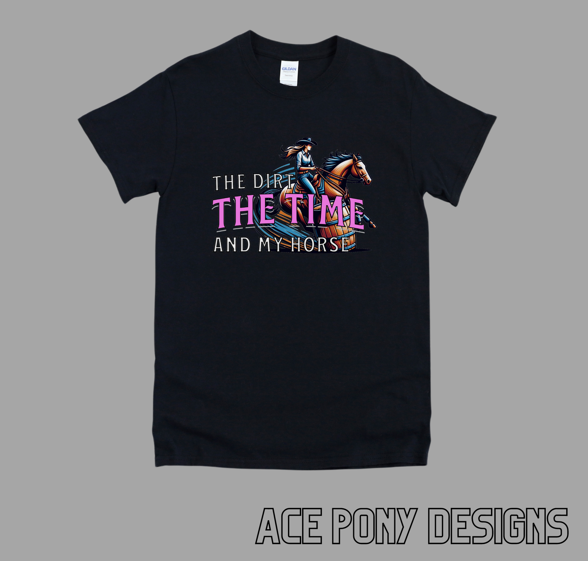 Show off your love for barrel racing while looking and feeling great with the saying "The Dirt. The time. And my Horse"