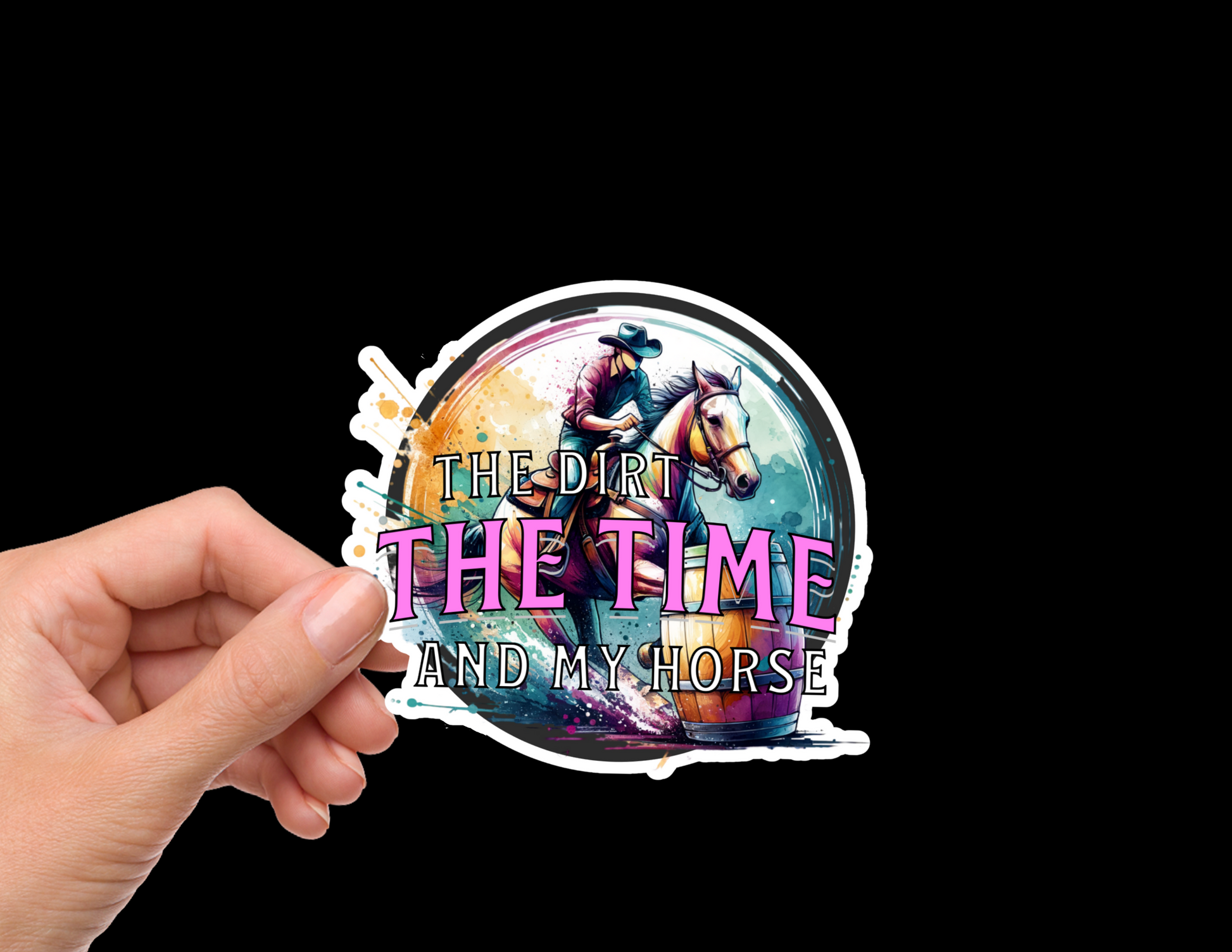 "The Dirt The Time And My Horse" Barrel Racer Bumper Sticker Decal