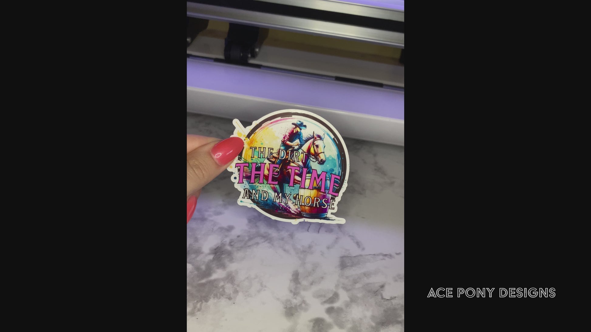 Introducing "The Dirt The Time And My Horse" Bumper Sticker Decal.